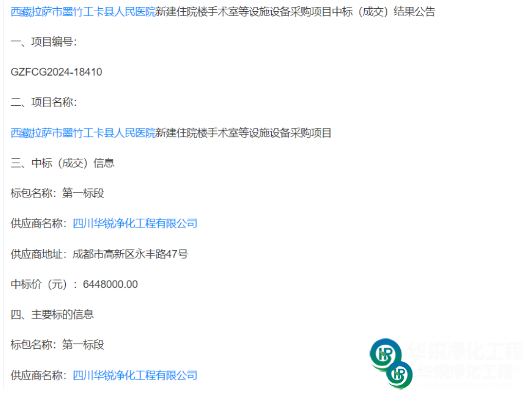 四川華銳化工程有限公司中標西藏拉薩墨竹工卡醫院凈化工手術室建設項目