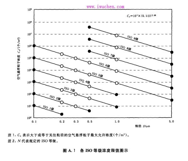 圖 A. l 是表 1空氣潔凈度等級的圖示 ,僅起說明作用 。表 1的 ISO 等級在圖中以直線表示 ,直線代表關(guān)注粒徑閾值所對應(yīng)的等級濃度限值 。這些限值是根據(jù) 3. 2 中的式(1) 計算得來 。而圖中的直線 只是等級限值的一種近似表示 ,不能以此確定限值,確定限值仍使用式 ) 。
